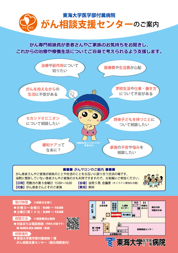 がん相談支援センターでは、専門の相談員が、がん治療や療養生活全般の相談に対応します。患者さんやご家族の質問や相談をお受けし、情報探しのお手伝いをしたり、問題解決に向けて一緒に考えていきます。