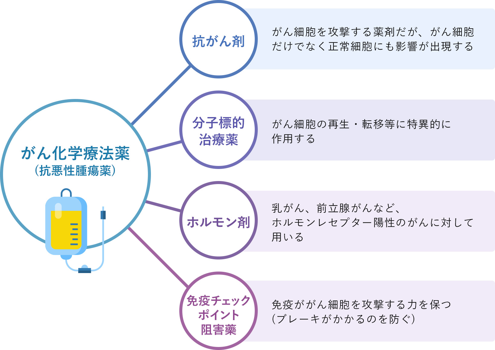 Cancer chemotherapy is a systemic treatment for cancer. There are four types: anticancer drugs, molecular targeted drugs, hormone drugs, and immune checkpoint inhibitors.