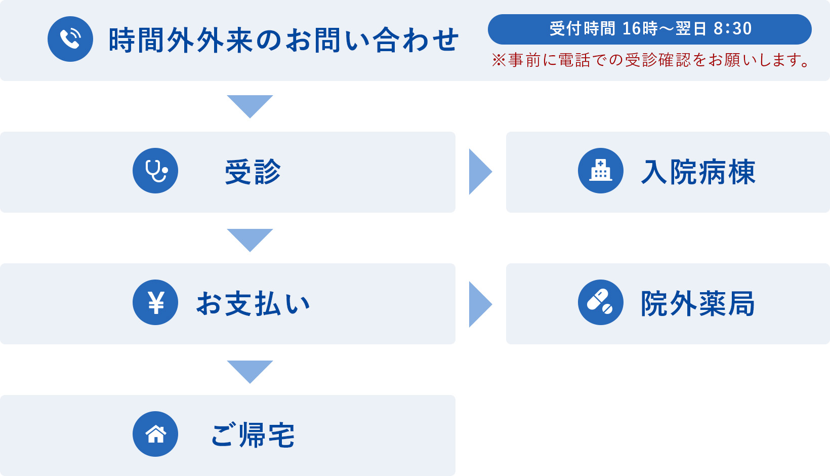 The procedure for outpatient appointments outside of business hours, such as at night or on holidays, is as follows: