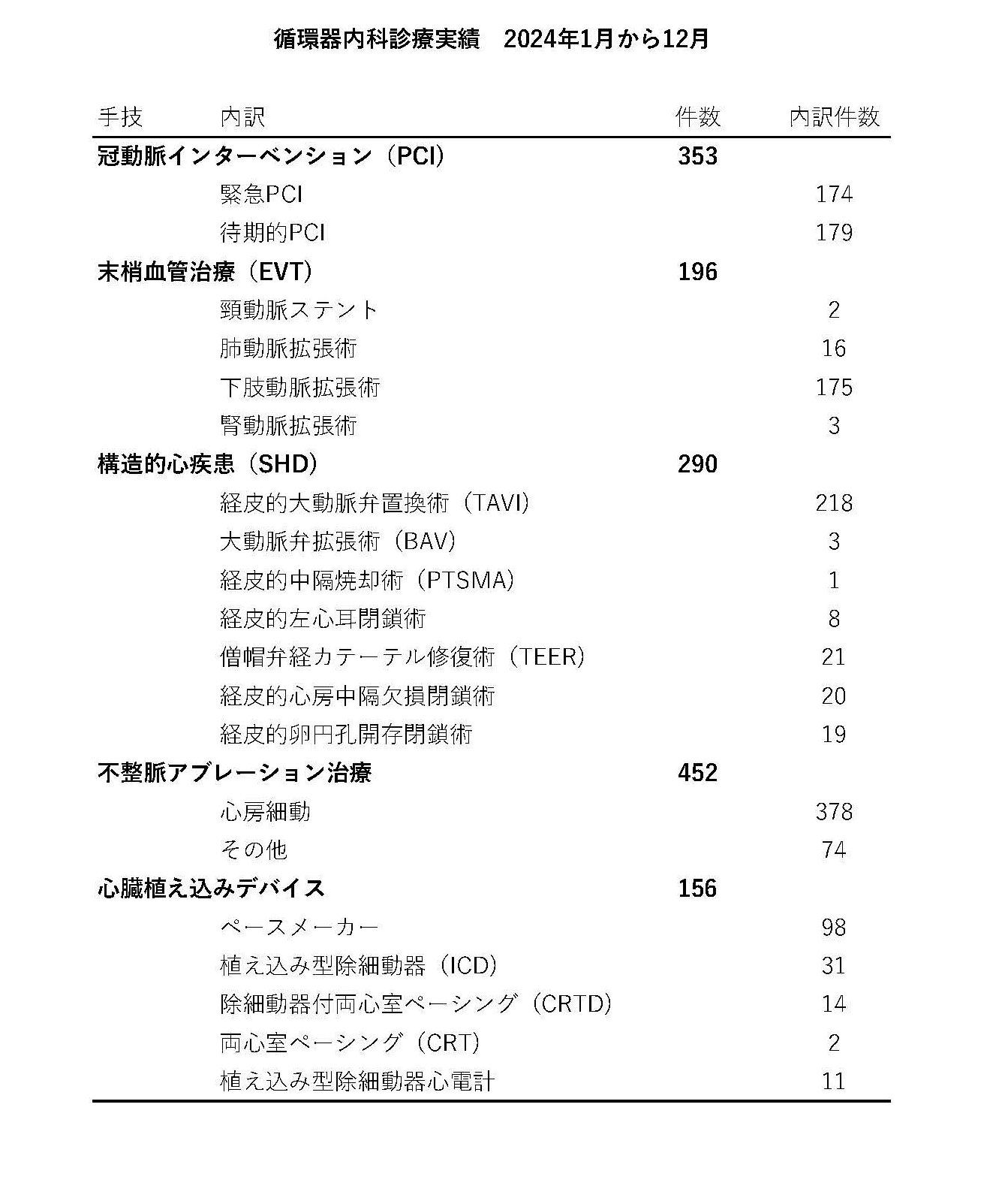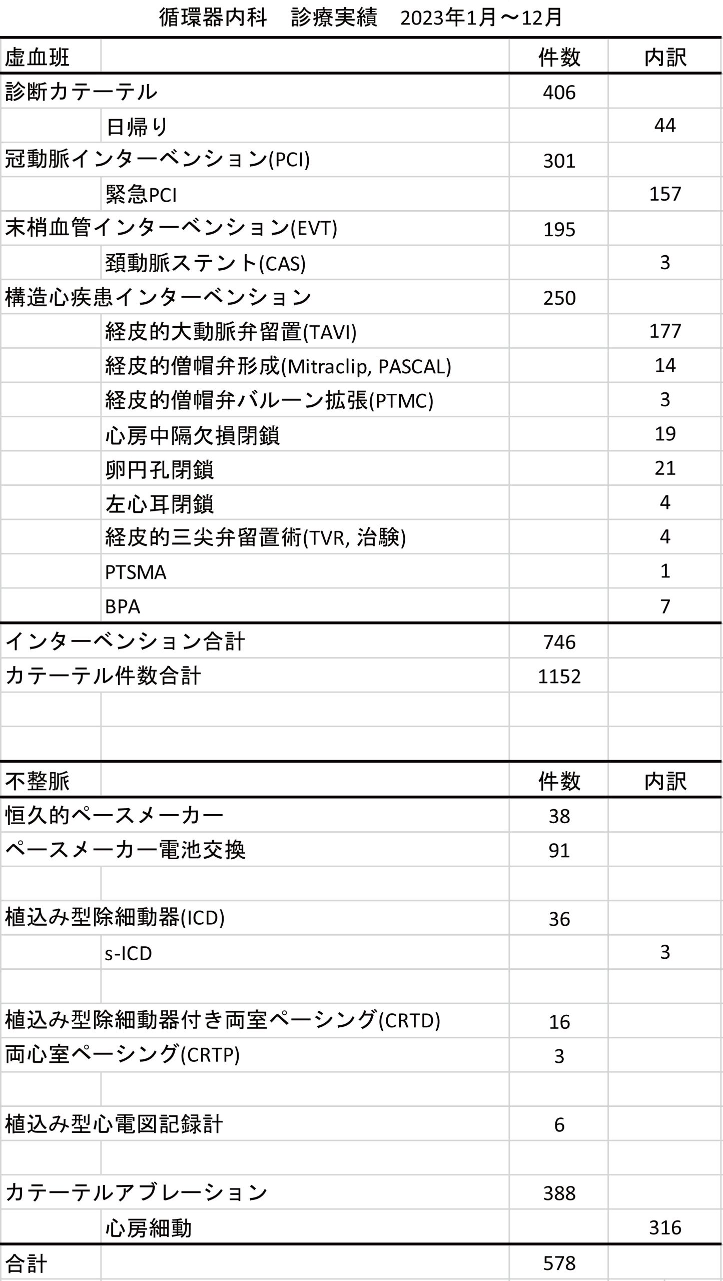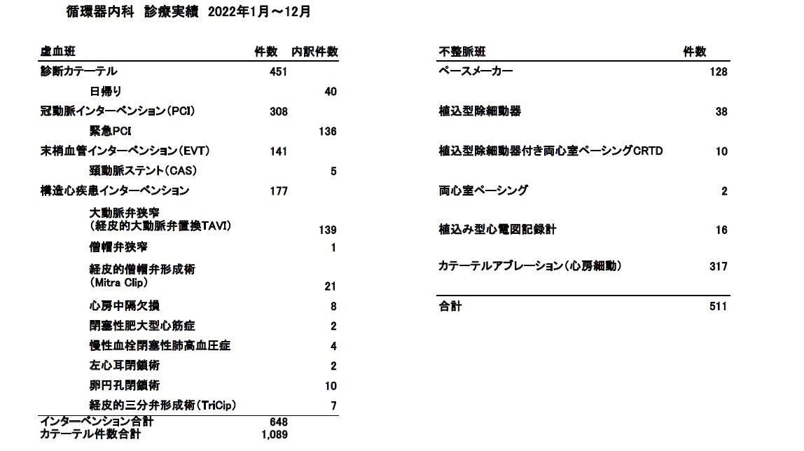 We offer cutting-edge treatments, including coronary artery rotablization, laser angioplasty, and carotid artery stents. Diagnostic coronary catheterization is also available on an outpatient basis. We have consistently achieved results with implantable treatments for arrhythmias and implantable Holter monitors. PCI for multivessel disease is performed all at once, so although the number of elective PCI cases appears low, patients are pleased with the service.