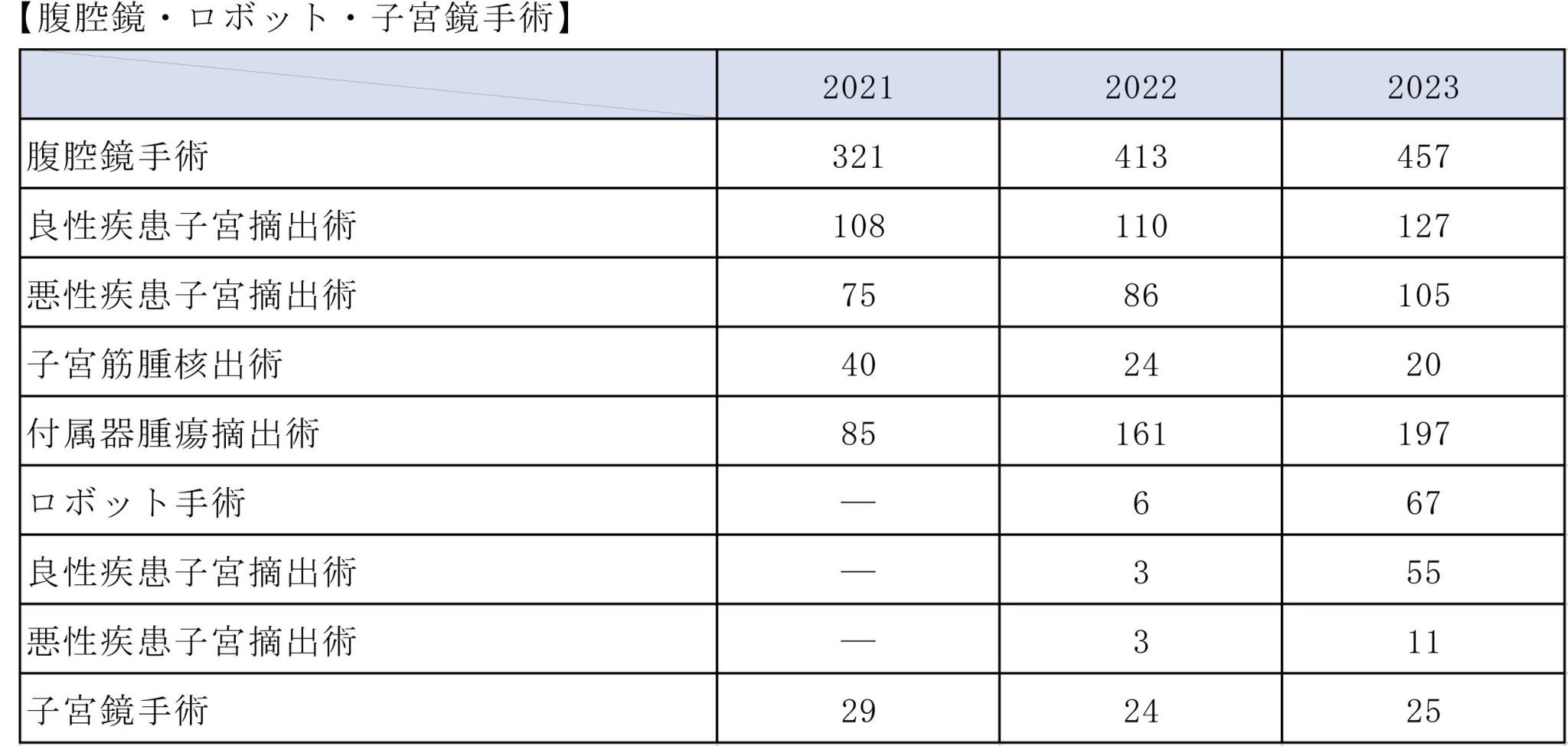 In 2023, we performed a total of 237 gynecological cancer surgeries, of which 116 were minimally invasive surgeries using laparoscopy or robots. We perform anti-cancer drug treatments for a total of more than 800 cases per year.