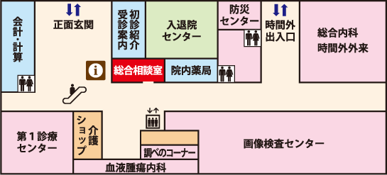 病気やけがによって、様々な生活上の心配事や不安が起こってくることがあります。 総合相談室では、このような時、専門の相談員である医療ソーシャルワーカー(社会福祉士)が、患者さんやご家族の相談に応じています。相談の内容により、医師や看護師、保健師、管理栄養士、薬剤師などと相談し、また必要に応じて行政機関、相談機関、医療機関をご紹介しています。