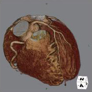 近年画像診断装置の開発は著しく、心臓のような拍動している臓器でもCTやMRIにて鮮明な画像を撮ることができるようになりました。 当院では最新の128列デュアルソースCTを用いて冠動脈CT検査(CT coronary angiography: CTCA) を行っています。ヨード造影剤を静注しながら心電図同期下に撮影を行い、ある同一心時相の画像を再構成し静止画像として描出し評価します。128列デュアルソースCTでは、冠動脈のような拍動する細い血管でも高精細な画像が得られるため、冠動脈造影との比較でも高い診断能を有しています。狭窄有無の評価のほか、動脈硬化によるプラークの性状評価もCT値から予測することも可能です。実際の撮影は呼吸停止10秒以下で冠動脈全体の範囲が撮影でき、検査の準備も含め15分前後で検査が終了します。外来の通常検査枠で行っていますが、医療連携室を介して直接近隣の医療施設からの紹介でも検査可能です。