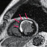 また最新鋭の装置を用いて心臓MRI検査も行っています。全体の撮影自体は40分から1 時間とやや長いですが、1 回の検査で心臓の形態評価、心機能評価、心筋性状の評価が行えます。心筋梗塞の患者では心筋梗塞の範囲が描出できるため、心筋のバイアビリティの診断も可能です。そのほか、心筋症、心筋炎などさまざまな疾患の診断が可能で、心不全の原因評価、治療効果の評価などにも用いています。また造影剤を用いずに冠動脈を撮影する方法もあり、喘息や腎不全など造影剤が使用できない患者さんに有用です。
