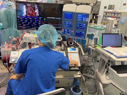 当科では、現在7名の体外循環技術認定士が心臓血管外科と緊密な連携のもとに、体外循環業務に従事しています。さらに、24時間常に対応できる体制を敷いており、緊急手術にも対応しています。